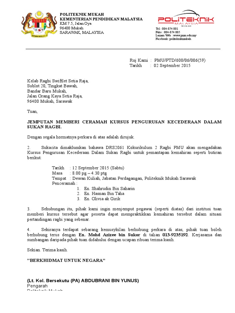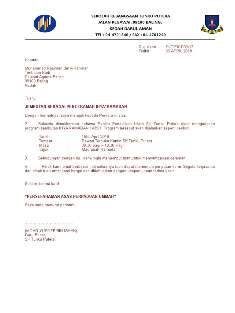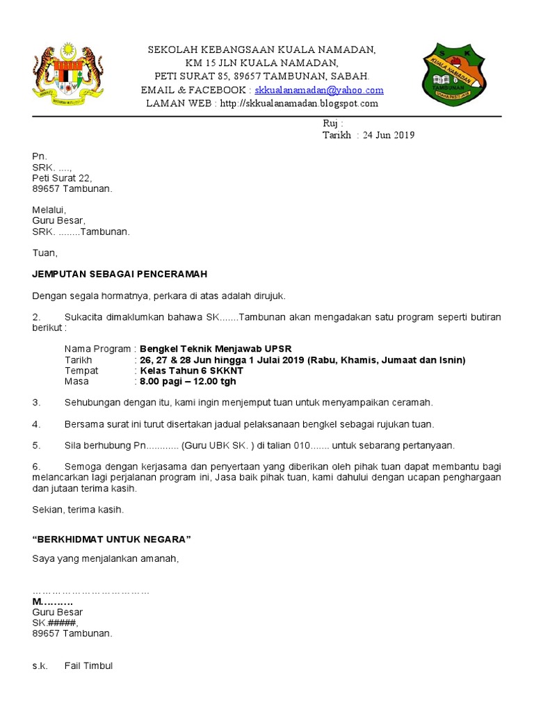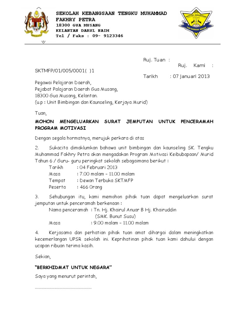Untuk menjemput orang luar hadir memberikan ceramah di sekolah kita. Diisi Dalam 2 Salinan. Contoh surat jemputan penceramah ruj.